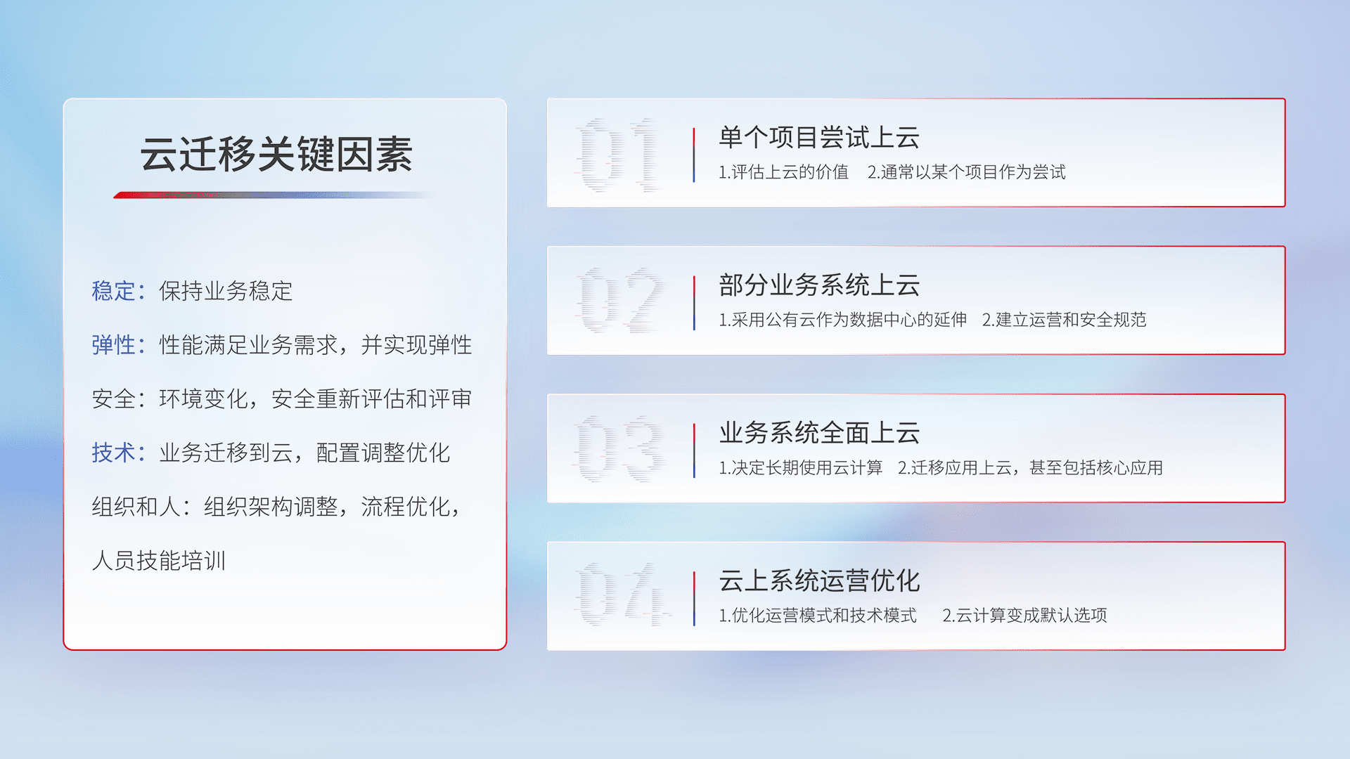 结合实际业务,,,,从规划设计、、、、云平台选型、、、、云原生改造、、数据迁移、、集成交付,,,迁移全过程为客户识别最佳上云路径,,,做好风险识别管理,,,,设计网络架构、、身份权限、、、安全审计合规、、、操作审计、、日志审计、、、监控告警策略、、、多站点容灾设计等,,,,对云上基础设施进行整体规划,,,提升IT治理水平,,,,以满足弹性、、、高可用、、、、高性能的需求。。。