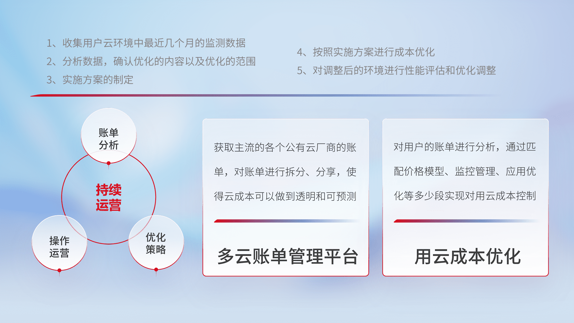 通过多云纳管,,,,以统一的资源数据模型把客户的云资源进行抽象和封装,,,,进而实现对多云资源的统一操作,,,,保障云资源管理的可靠性、、稳定性与可用性。。。。量身定制化运维内容,,,,配置、、、、开发运维、、补丁管理、、、、备份、、监控、、、、认证和访问管理、、审计和日常巡检等,,保障在用云过程中的可靠度,,稳定度以及高可用率。。